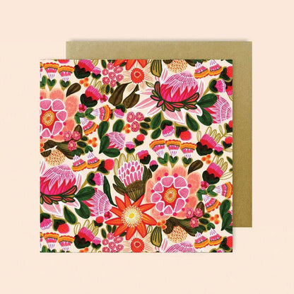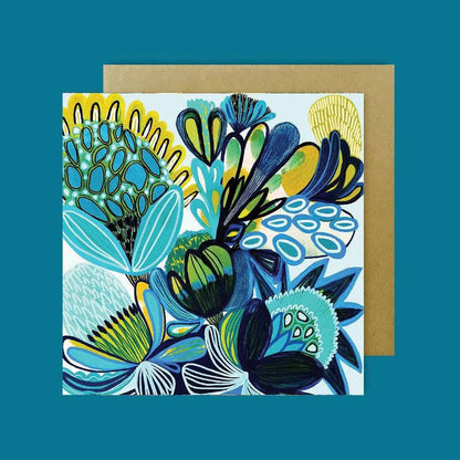 A set of 4 blank greeting cards with original paintings of Australian native flora. Designed by Australian artist Kirsten Katz and printed in Australia. This colourful set of cards is printed with four different original botanical paintings with proteas, banksias, gum blossoms and Australian flora.