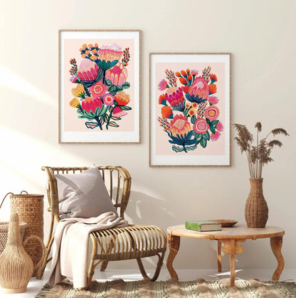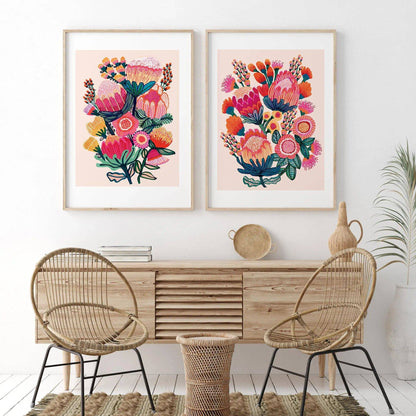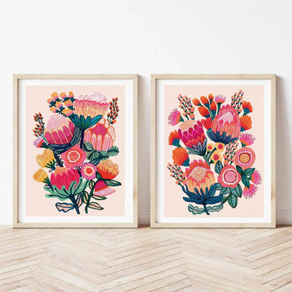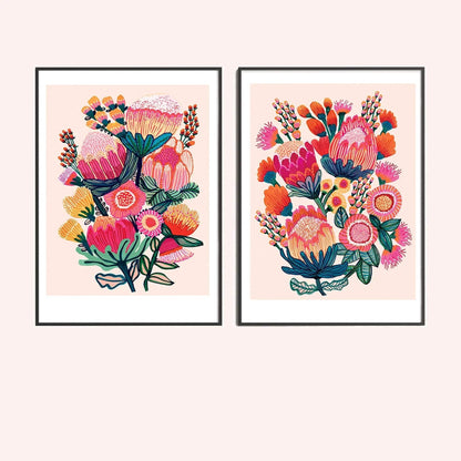Celebrate the beauty of native flora with this Australian Native Flowers Wall Art Print Set by Australian artist Kirsten Katz. Featuring two giclée prints of original hand-painted artworks, this set showcases stylised proteas, banksias, bottlebrush, and gum nut blossoms — a bold tribute to the wildflowers of the Australian bush.