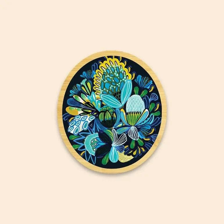 The ‘Azure Natives’ brooch with original artwork of Australian native flora featuring banksias and proteas.