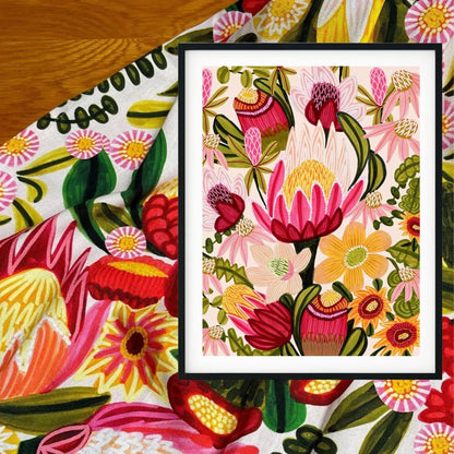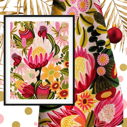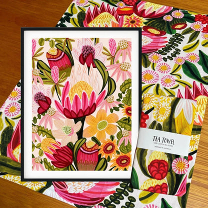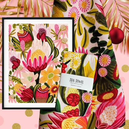 A unique gift set by Australian artist and textile designer Kirsten Katz. This gift set includes a matching giclee art print of an original painting and a designer cotton tea towel with protea flowers.