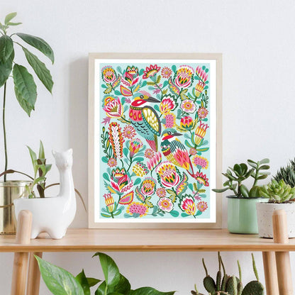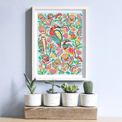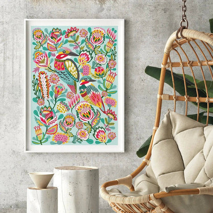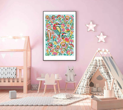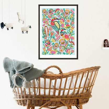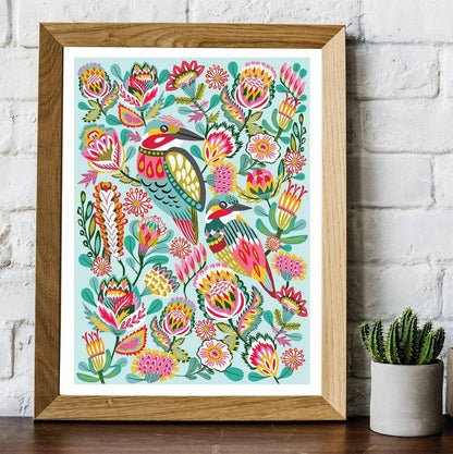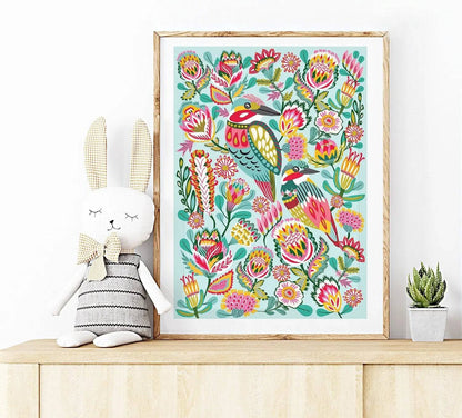 Introducing the gorgeous Kingfisher Birds Wall Art Print by Australian artist and designer Kirsten Katz. This stunning giclee print features a vibrant array of colours, making it the perfect addition to any babies room, nursery or toddlers playroom.