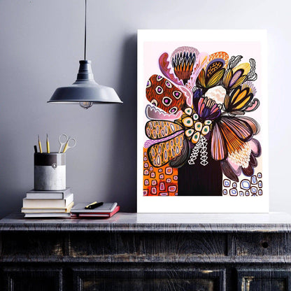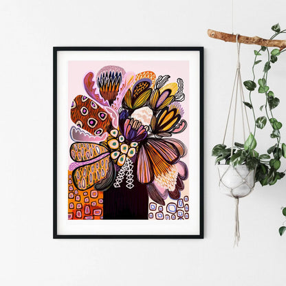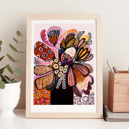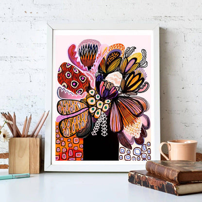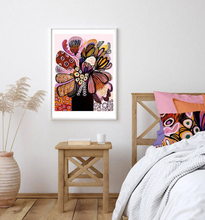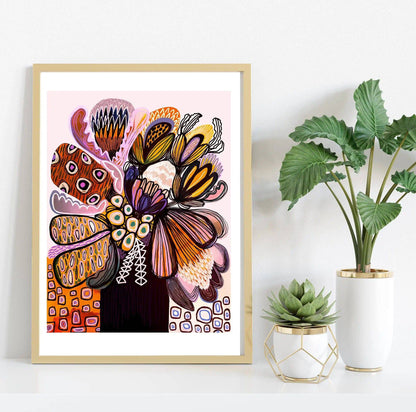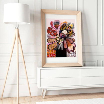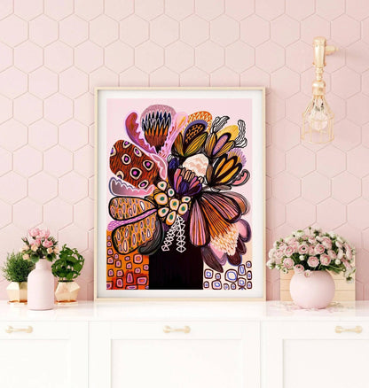 Looking to bring vibrant colour and contemporary design into your space? The Pink Proteas Abstract Wall Art Print by Australian artist Kirsten Katz offers a bold, modern take on native botanicals. Stylised proteas, gum nuts, and abstract florals come together in a rich palette of pinks, deep reds, and earthy neutrals — a striking composition full of movement and texture.