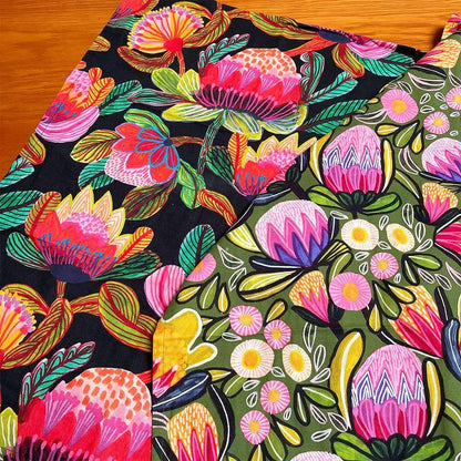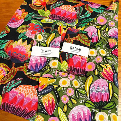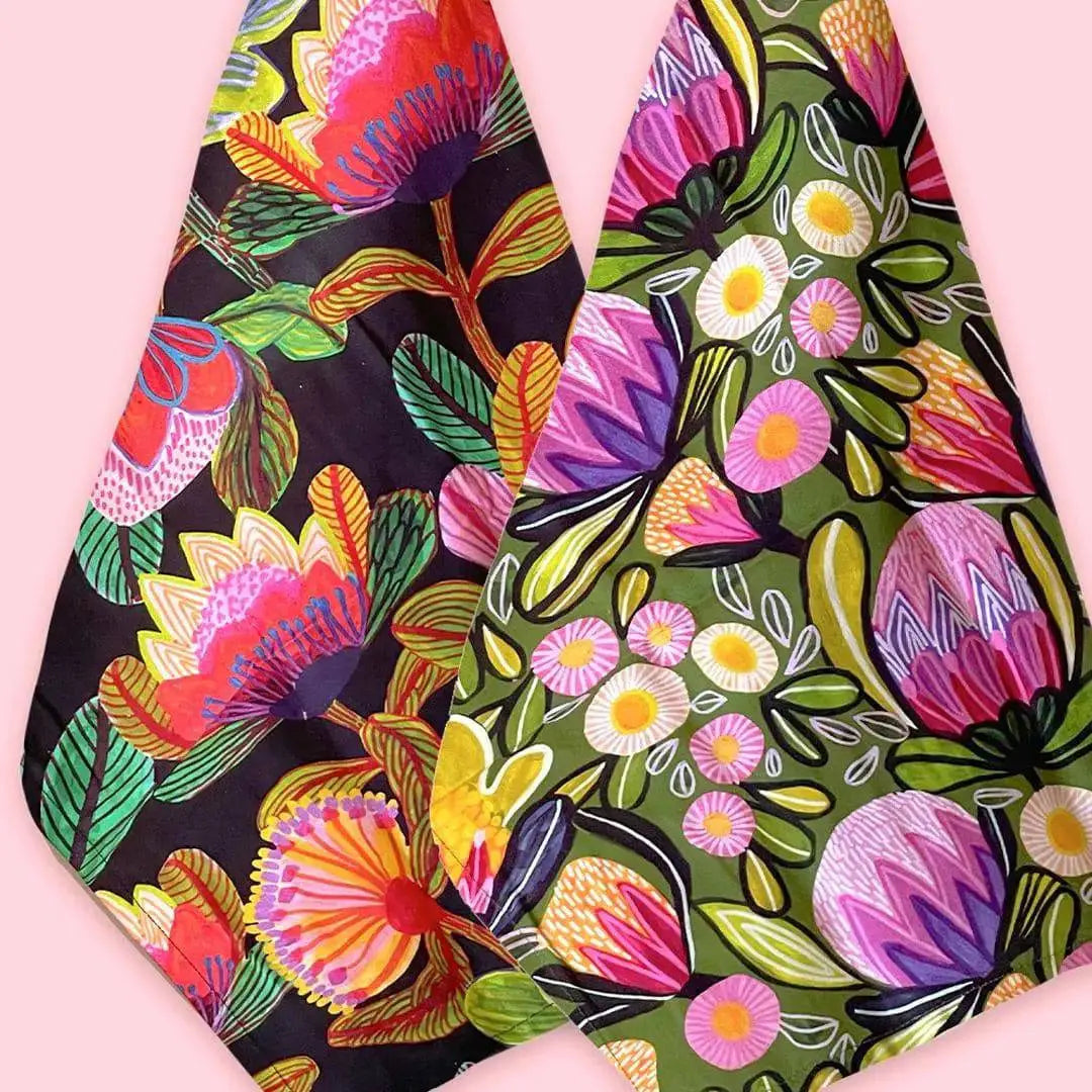 A set of 2 modern designer tea towels printed with original hand painted modern artworks of protea flowers by Australian artist Kirsten Katz.