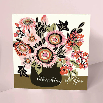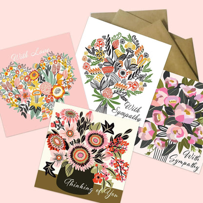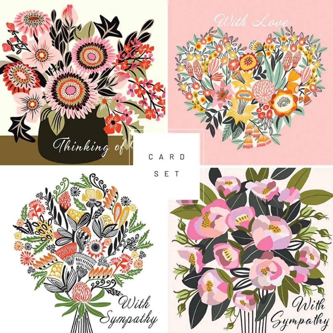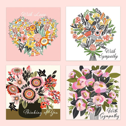 A set of 4 blank cards with different text on front of each card. Designed by Australian artist Kirsten Katz and printed in Australia. This colourful set of cards is printed with four different botanical prints with proteas, banksias, daffodils, peonies, roses, daisies and dahlias.