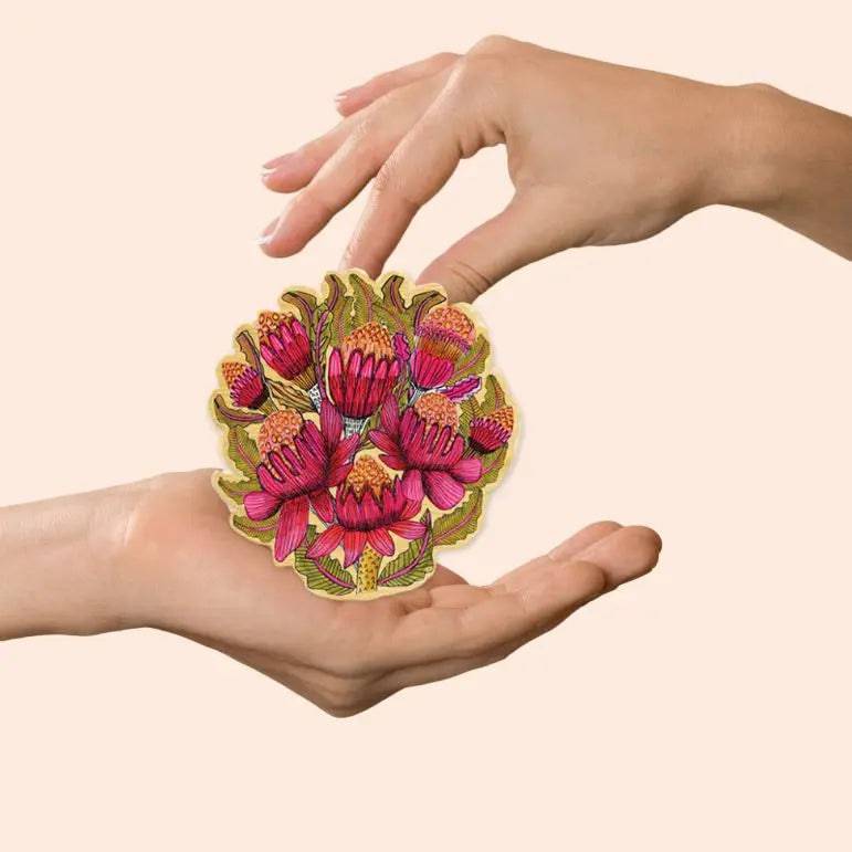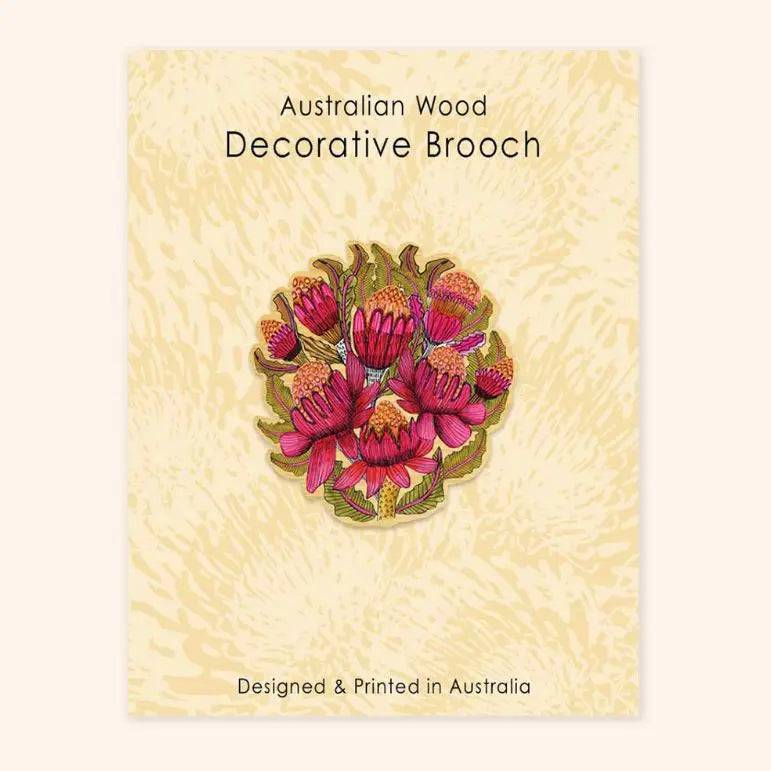 This stunning wooden brooch is decorated with original artwork featuring Australian Waratah flowers designed by Kirsten Katz.