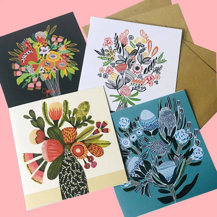 A set of 4 blank greeting cards with Australian native flowers in bouqets. Designed by Australian artist Kirsten Katz and printed in Australia. This colourful set of cards is printed with four different botanical paintings filled with Australian proteas, banksias, gum nuts, kangaroo paws, waratahs and Australian flora.