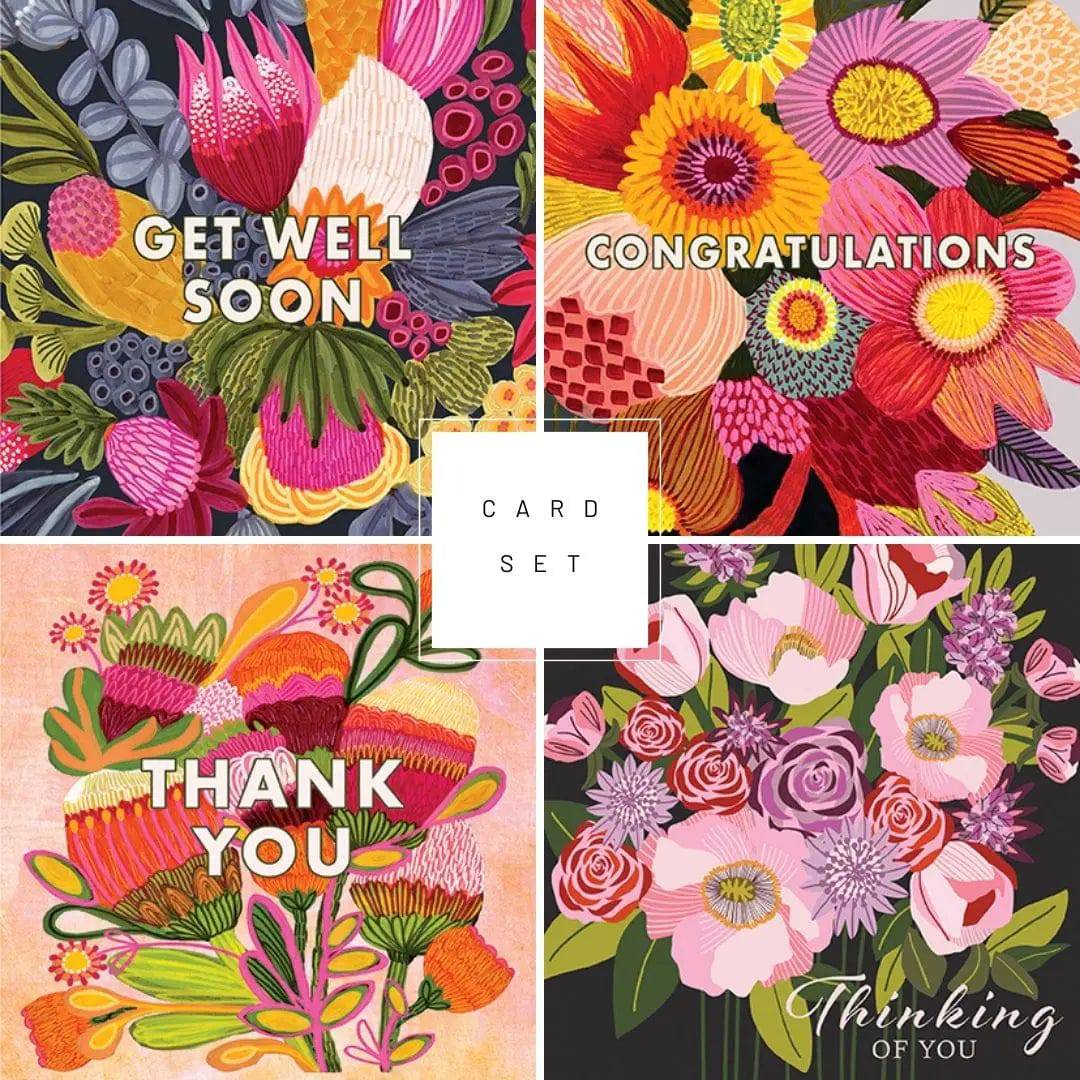 A set of 4 blank greeting cards with Australian native flowers. Designed by Australian artist Kirsten Katz and printed in Australia. This colourful set of cards is printed with four different botanical paintings with proteas, banksias, gum blossoms, waratahs and Australian flora.