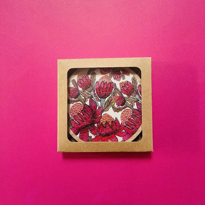 These coasters are made of ethically sourced and sustainable Australian eucalyptus wood, and are printed with an original watercolour painting of Australian Waratah flowers by Kirsten Katz. The inks used are Greenguard Gold certified, ensuring that they are safe for you and your family.