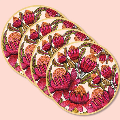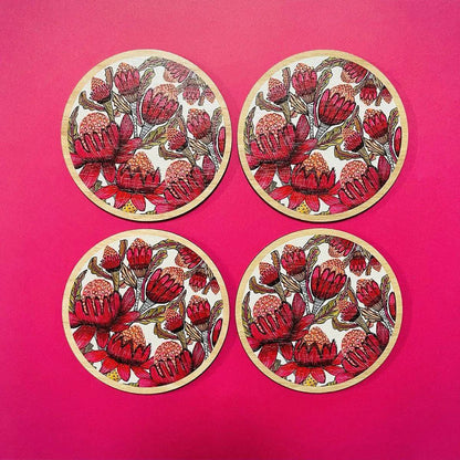 Introducing the Waratah Flowers Wooden Coasters, the perfect addition to your home or office.