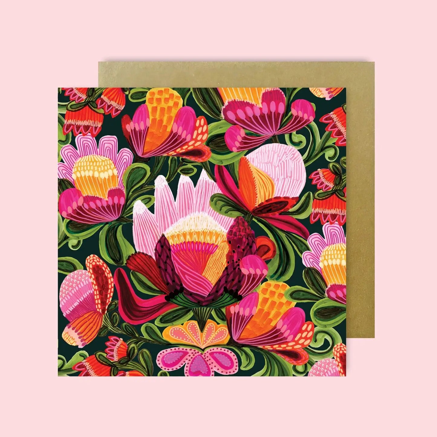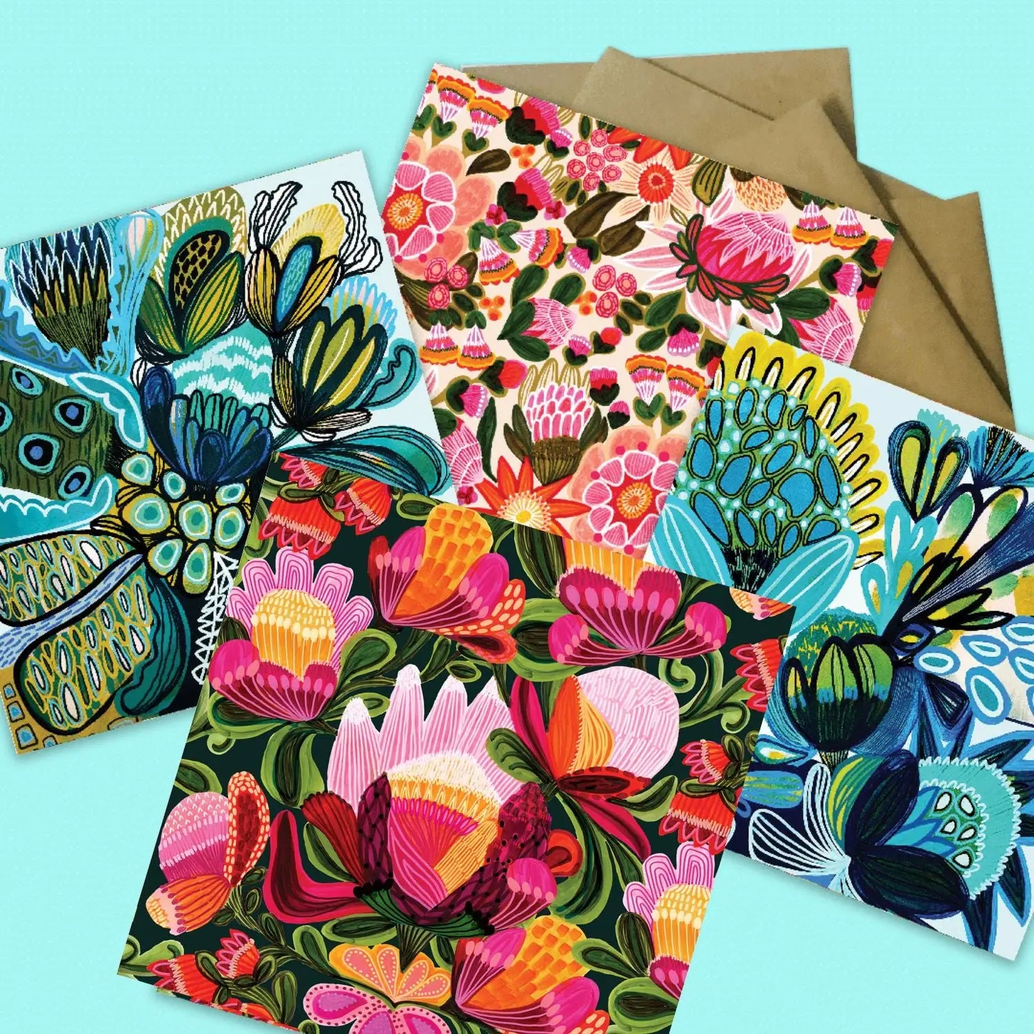 A set of 4 blank greeting cards with original paintings of Australian native flora. Designed by Australian artist Kirsten Katz and printed in Australia. This colourful set of cards is printed with four different original botanical paintings with proteas, banksias, gum blossoms and Australian flora.