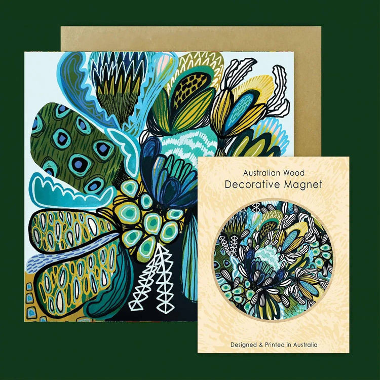 Introducing the Azure Proteas Modern Australian Eucalyptus Wooden Magnet & Card Gift Set – a stylish and unique gift set featuring original abstract art designed by Australian artist Kirsten Katz.