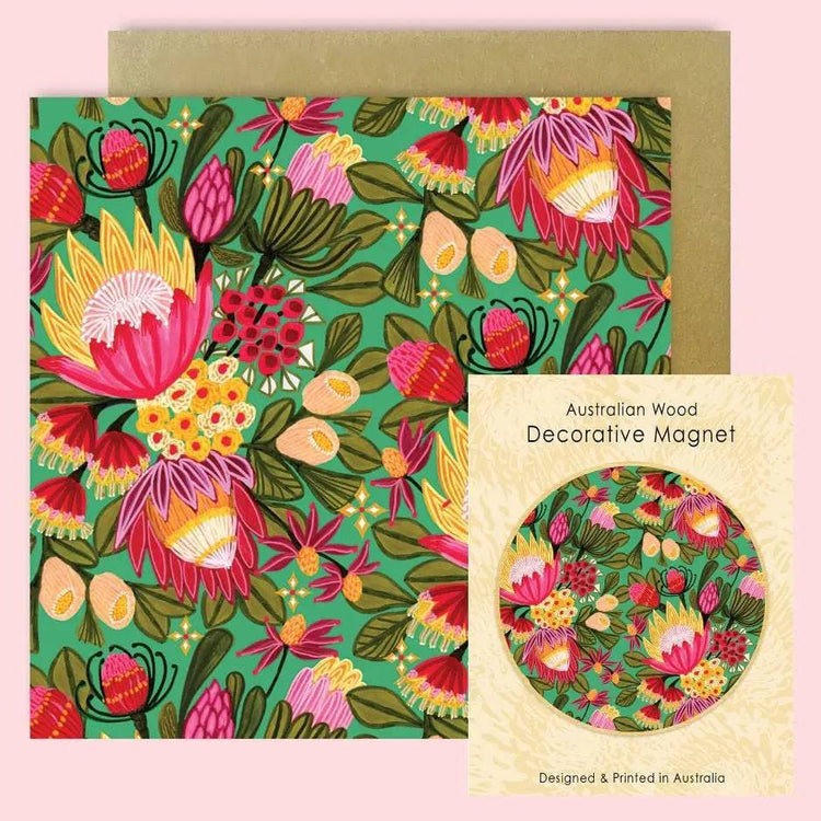 Step up your gift-giving game with this stunning wooden magnet and greeting card set, featuring colourful protea flowers in festive colours.