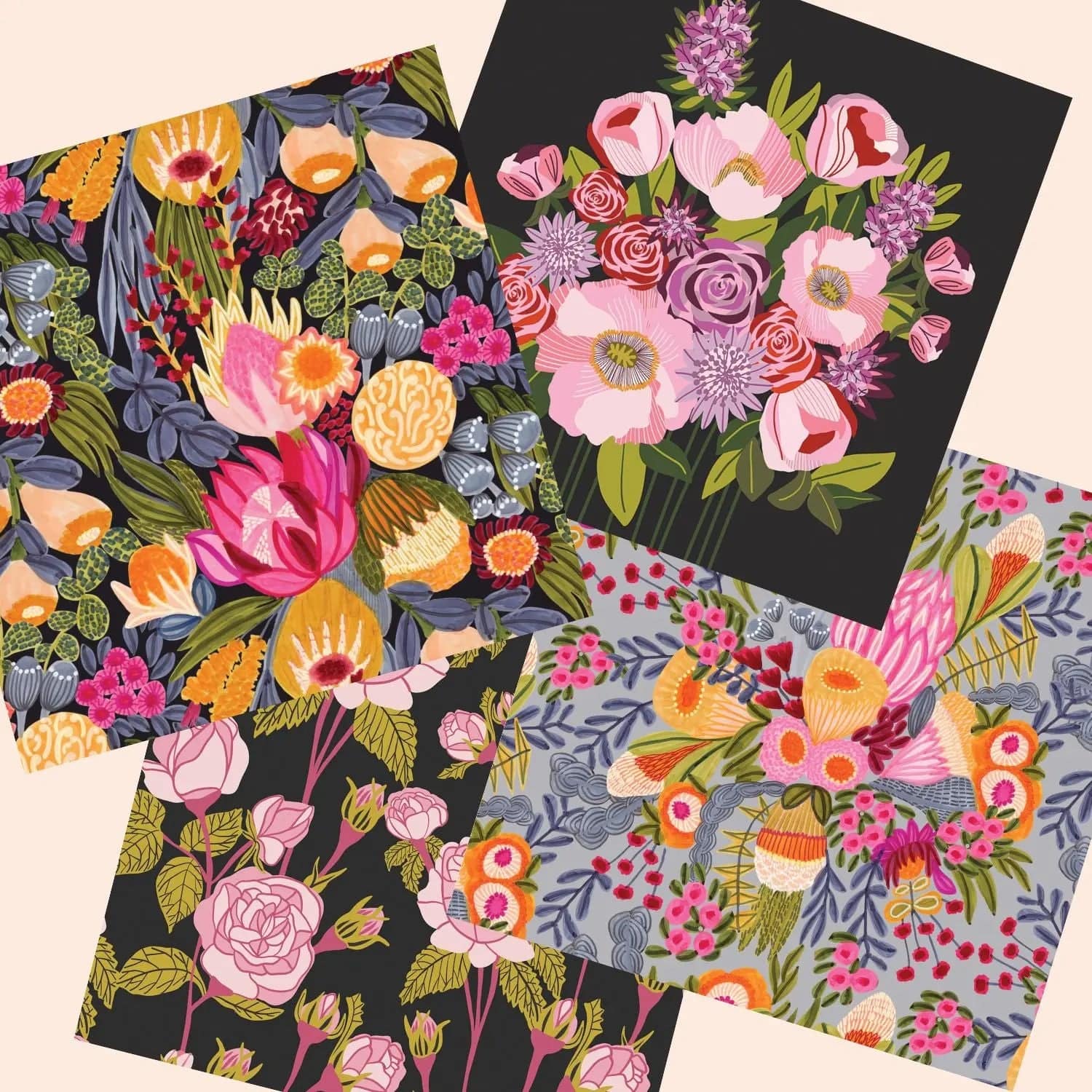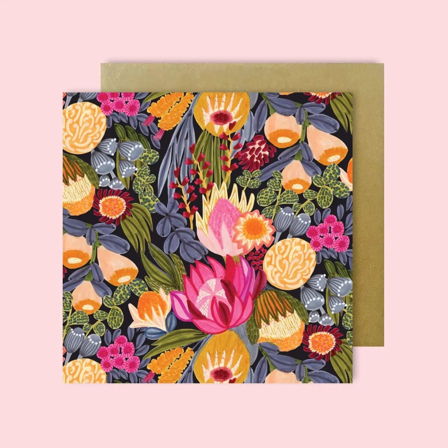 A set of 4 blank greeting cards with botanical flowers. Designed by Australian artist Kirsten Katz and printed in Australia. This colourful set of cards is printed with four different botanical paintings with proteas, banksias, roses, poppies and botanical flora.