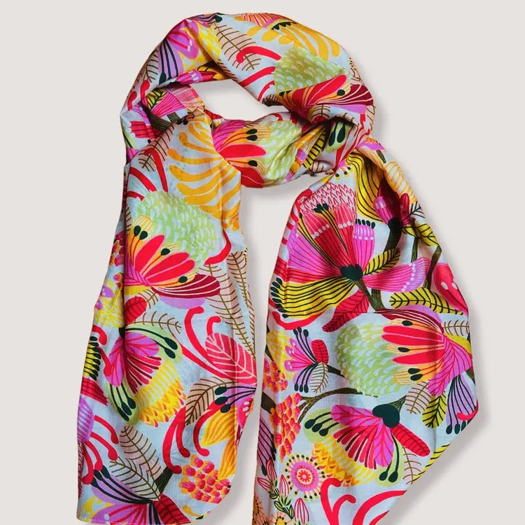 Add a touch of artistic elegance to your wardrobe with the Garden of Eden Silk Scarf by Australian artist Kirsten Katz. This luxurious scarf showcases her hand-illustrated signature print, featuring intricate botanical forms and modern design influences.