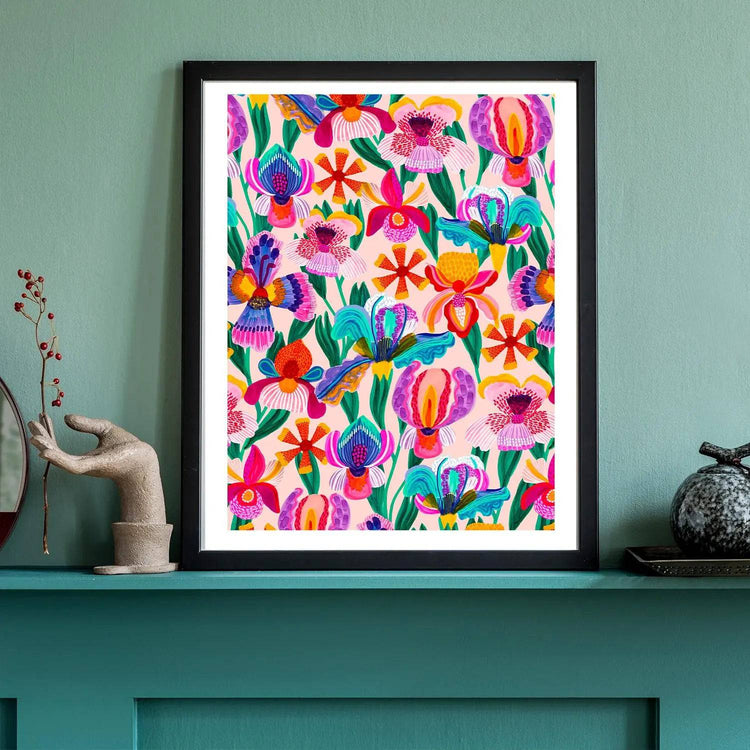 Botanical wall art capturing irises and orchids in elegant form — not generic garden prints with no depth.