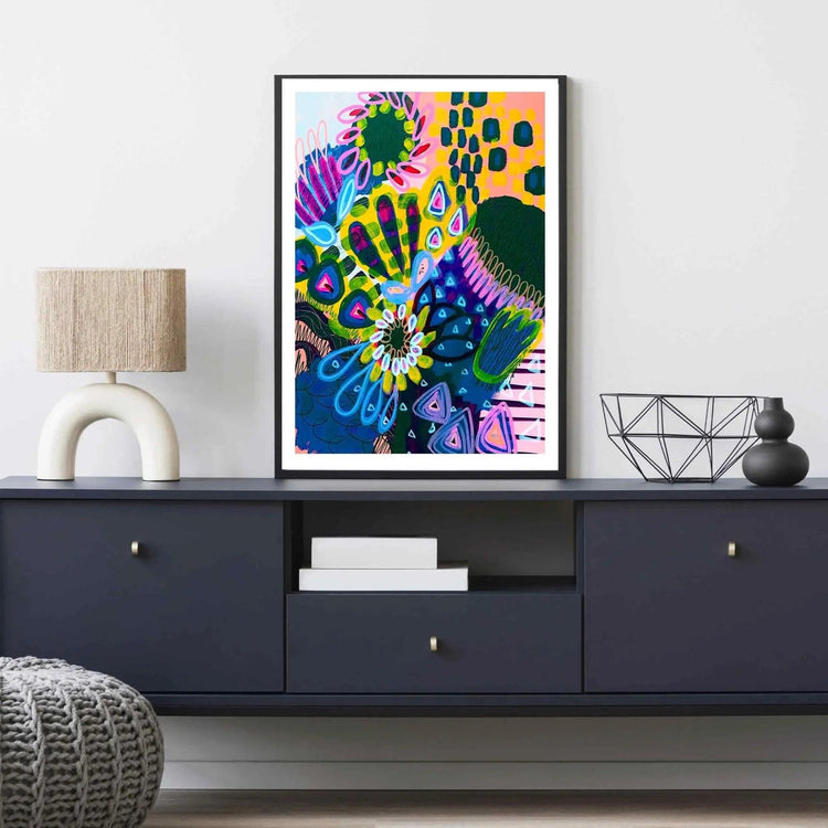 Make a bold statement with the Big Banksia Moody Wall Art Print by Australian artist Kirsten Katz. This modern abstract piece features a large Australian banksia, captured in rich tones of blue, teal, and green. Layered with intricate patterns and expressive brushwork, the artwork evokes both movement and mood.