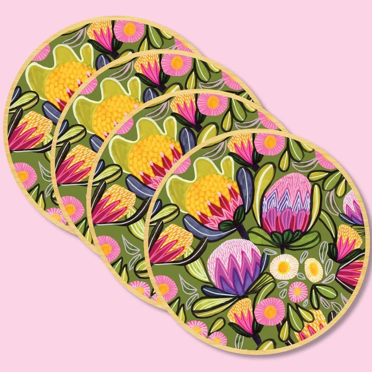 Introducing the Sugarbush Proteas Wooden Coasters: a set of 4 beautiful coasters printed with the original Sugarbush design by Kirsten Katz.