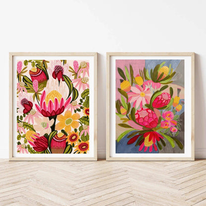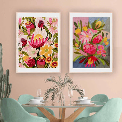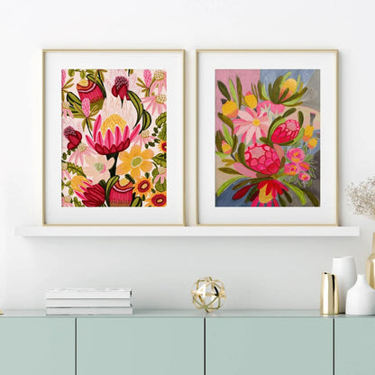Celebrate the beauty of native blooms with the Australian Flowers Botanical Wall Art Print Set by Australian artist Kirsten Katz. This set of two fine art giclée prints features stylised proteas, banksias, and flowering gum nuts — capturing the colour, texture, and natural elegance of Australia’s floral heritage.