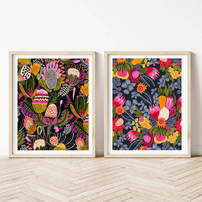 Celebrate the beauty of Australian flora with the Australian Flowers Botanical Wall Art Print Set by artist Kirsten Katz. This set of two giclée prints features stylised waratahs, proteas, banksias, and flowering gum nuts — capturing the richness of native blooms in vivid detail and layered colour.