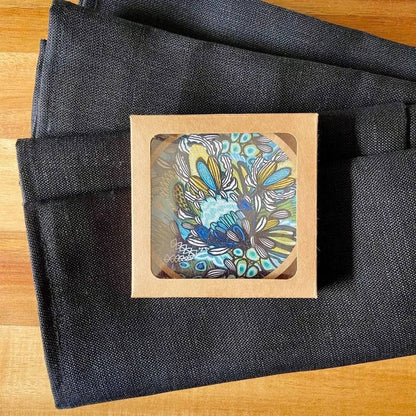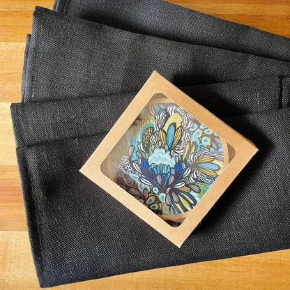 Showcasing four eco-friendly coasters with modern abstract artwork that features proteas and native Australian flowers, and four natural linen napkins, this sustainable tableware set is perfect for housewarmings, friends, and family. With its unique design and eco-friendly materials, these coasters and napkins are sure to add a touch of Australian style and artistry to your home entertaining!