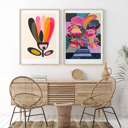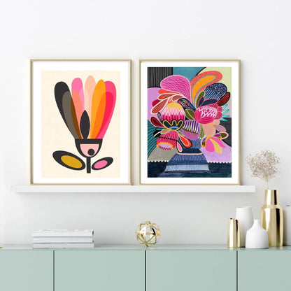 Colour your home with this set of two giclee art prints by Australian artist and designer Kirsten Katz. These colourful artworks feature a mid century modern protea flower print and a modern pop art still life painting. They are bold graphic prints with a contemporary colour palette. Sure to be a favourite for someone who loves modern art.