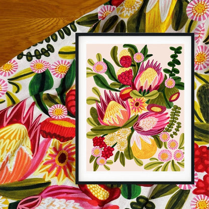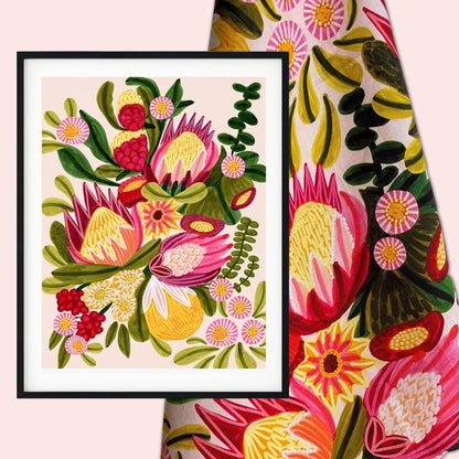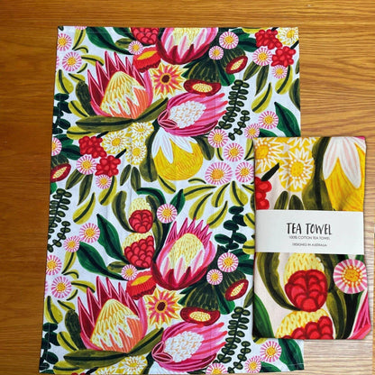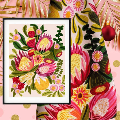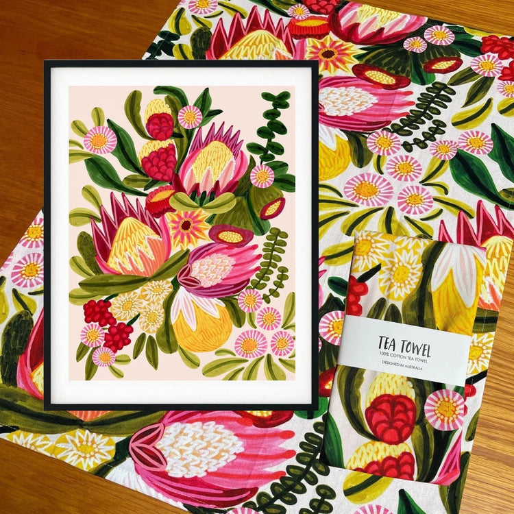 A unique gift set by Australian artist and textile designer Kirsten Katz. This gift set includes a matching giclee art print of an original painting and a designer cotton tea towel with protea flowers and festive colours.