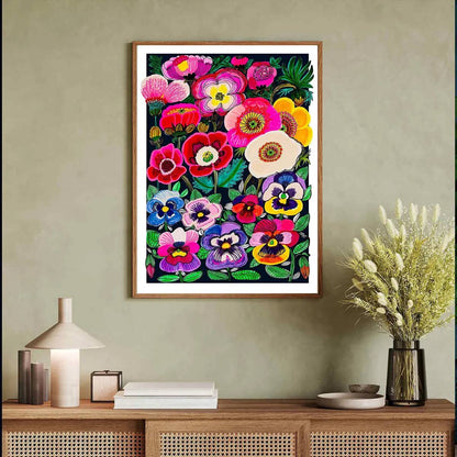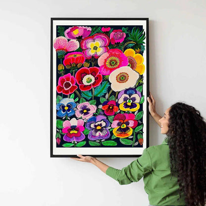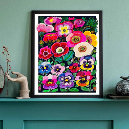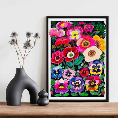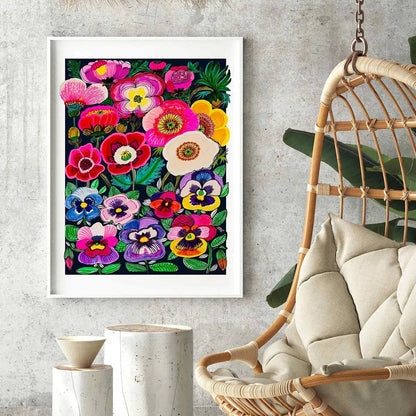 Revamp your space with our stunning Midnight Pansies and Poppies Wall Art Print. Based on an original painting by Australian artist Kirsten Katz, this modern wall art print features a colourful burst of florals against a dark background.