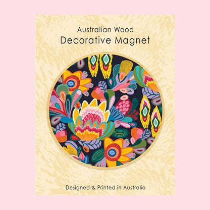 The round wooden magnet is printed using Greenguard Gold certified inks and is made from ethically sourced and sustainable Australian eucalyptus wood. It Measures 7cm in diameter and is the perfect way to add a touch of style to your fridge or other metal surface.