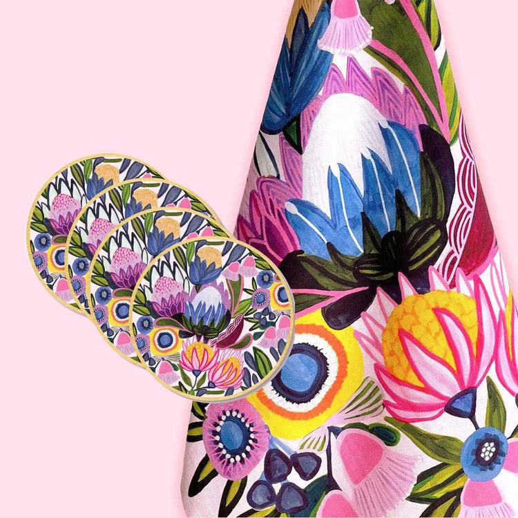 Introducing the Protea Magnifica Tea Towel & Coaster Set - a modern and stylish addition to any kitchen. This set includes a beautiful designer tea towel and set of 4 wooden coasters, all printed with stunning artwork of protea flowers by Australian artist Kirtsen Katz.