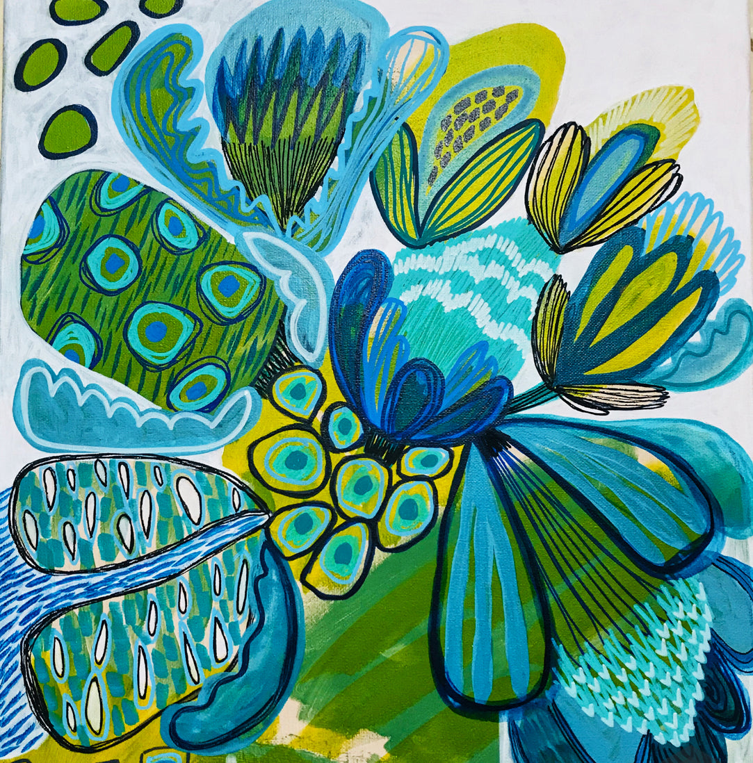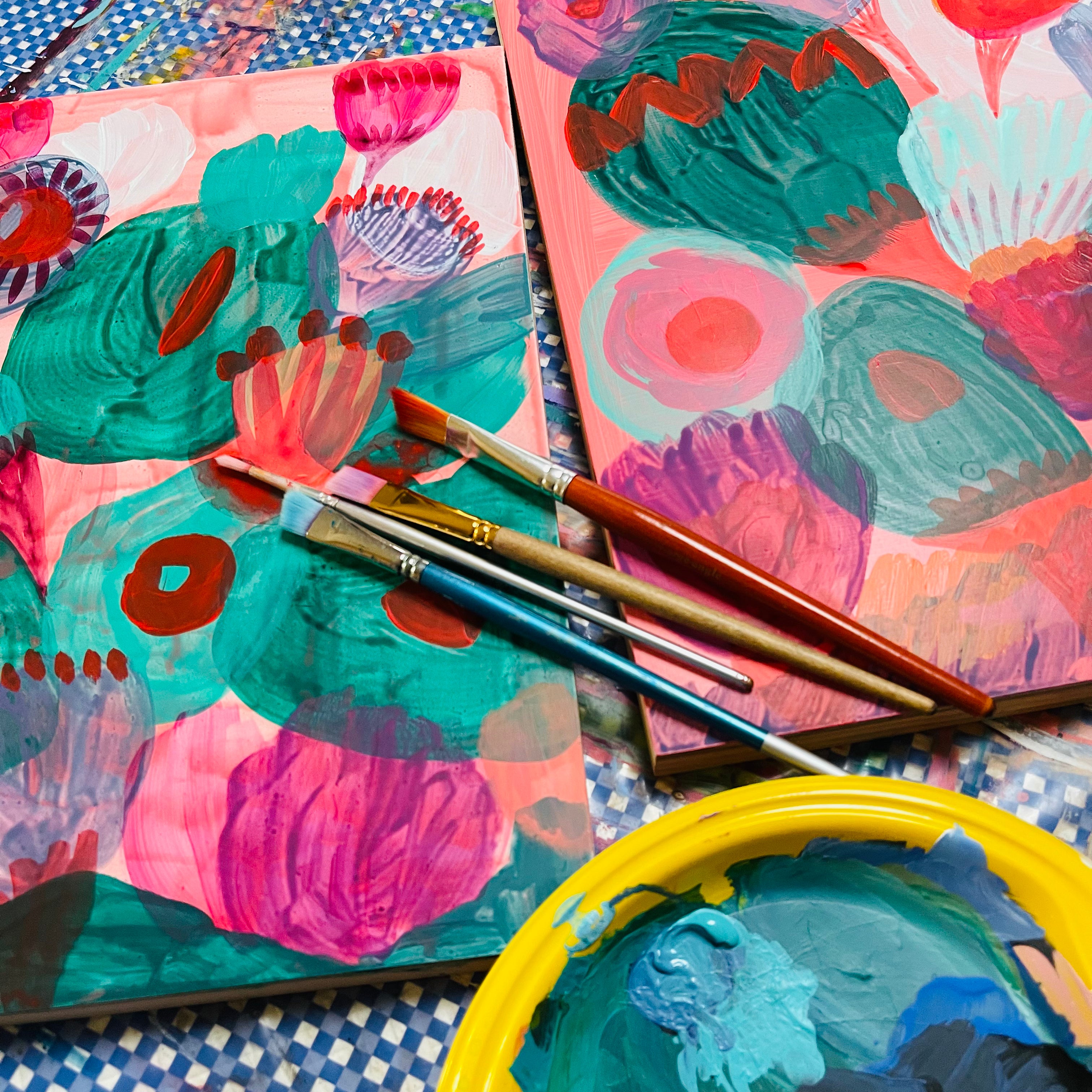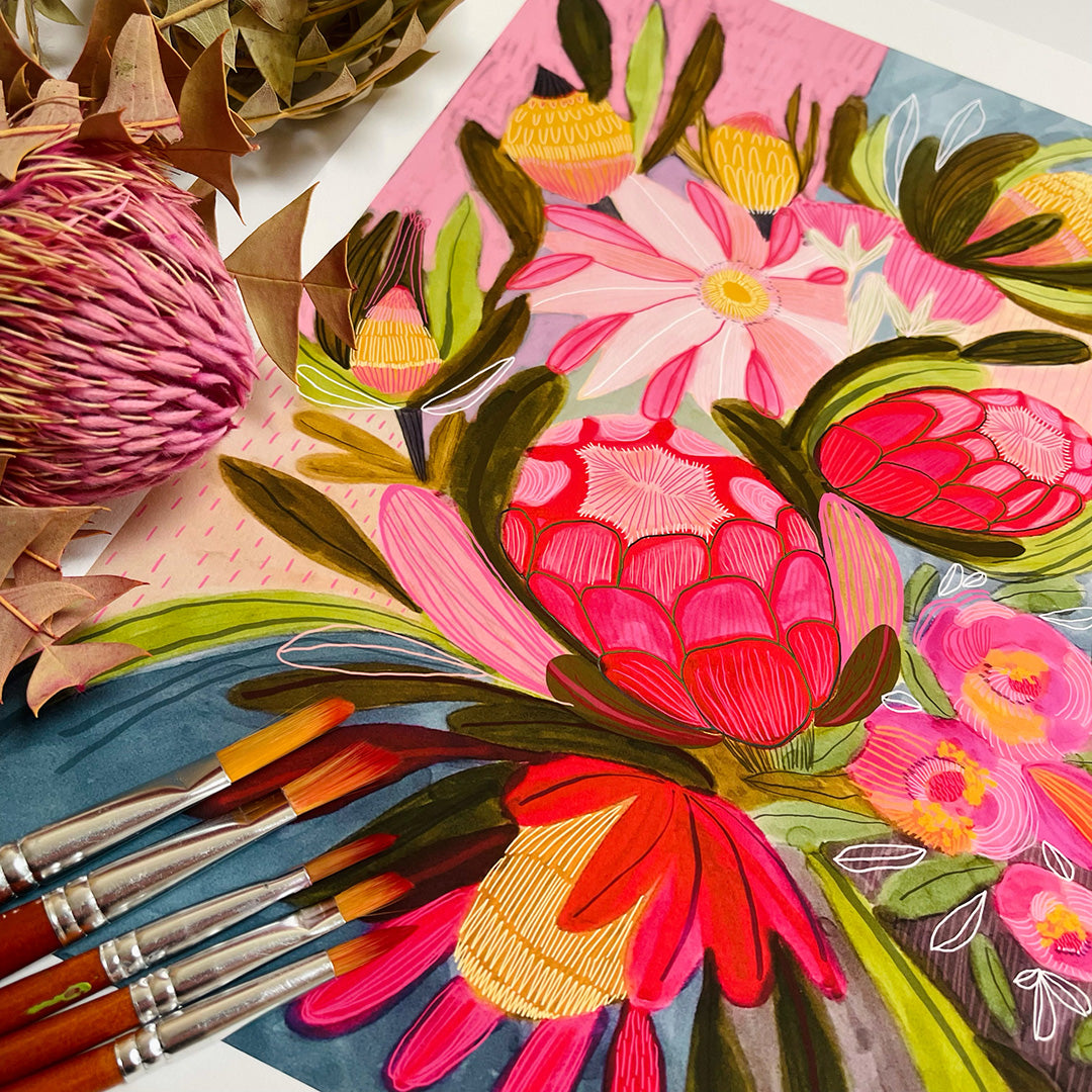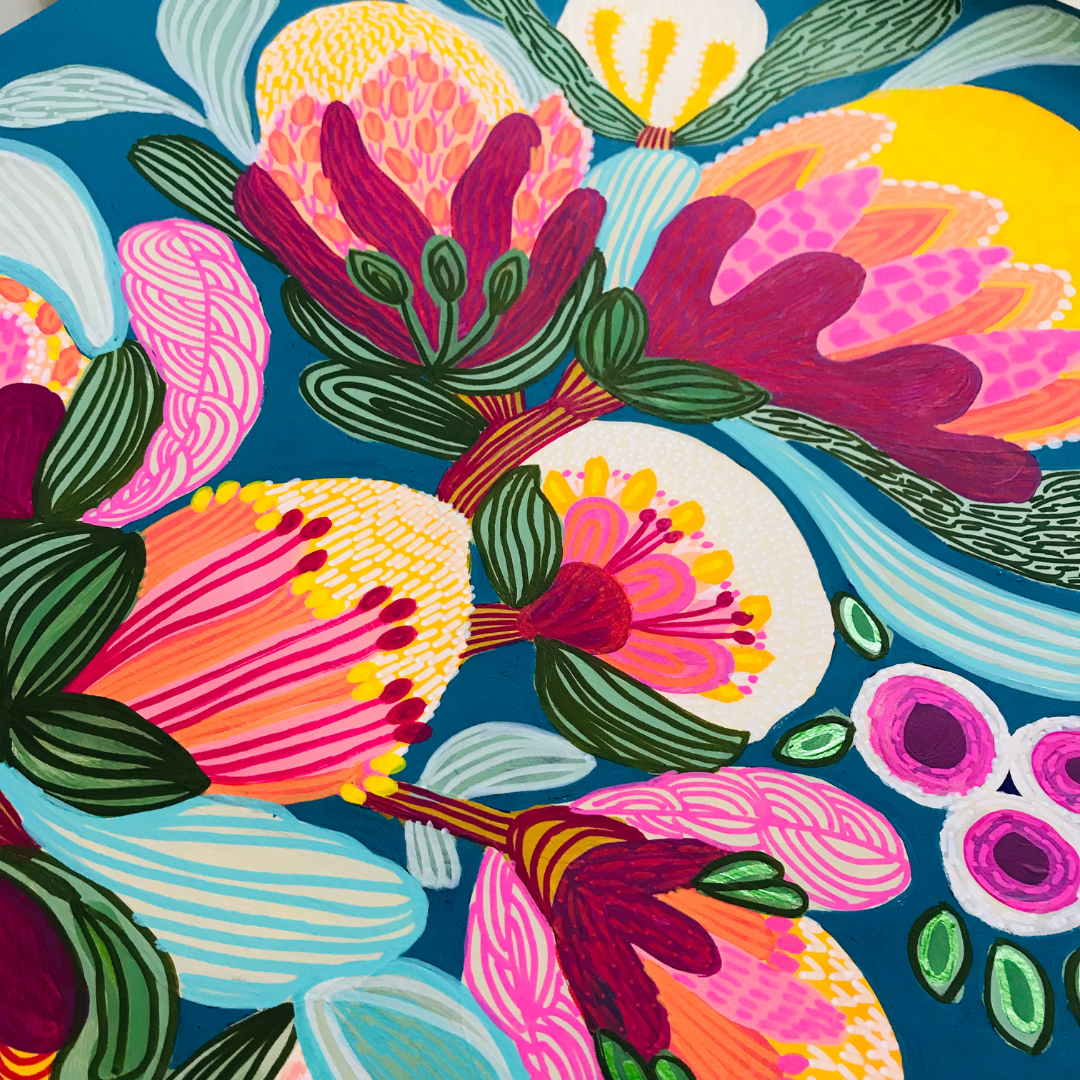 Each work is created slowly and intuitively, guided by colour, form, and feeling rather than fixed outcomes. While the paintings often begin with botanical reference, they are not literal representations. Instead, they are interpretations — shaped through layers, adjustment, and response — and refined over time until they feel resolved. These works exist as one-of-a-kind pieces, each holding its own presence while contributing to a broader, evolving body of work.