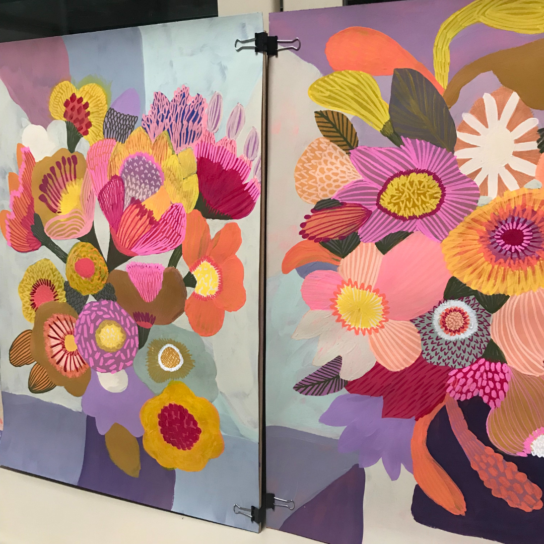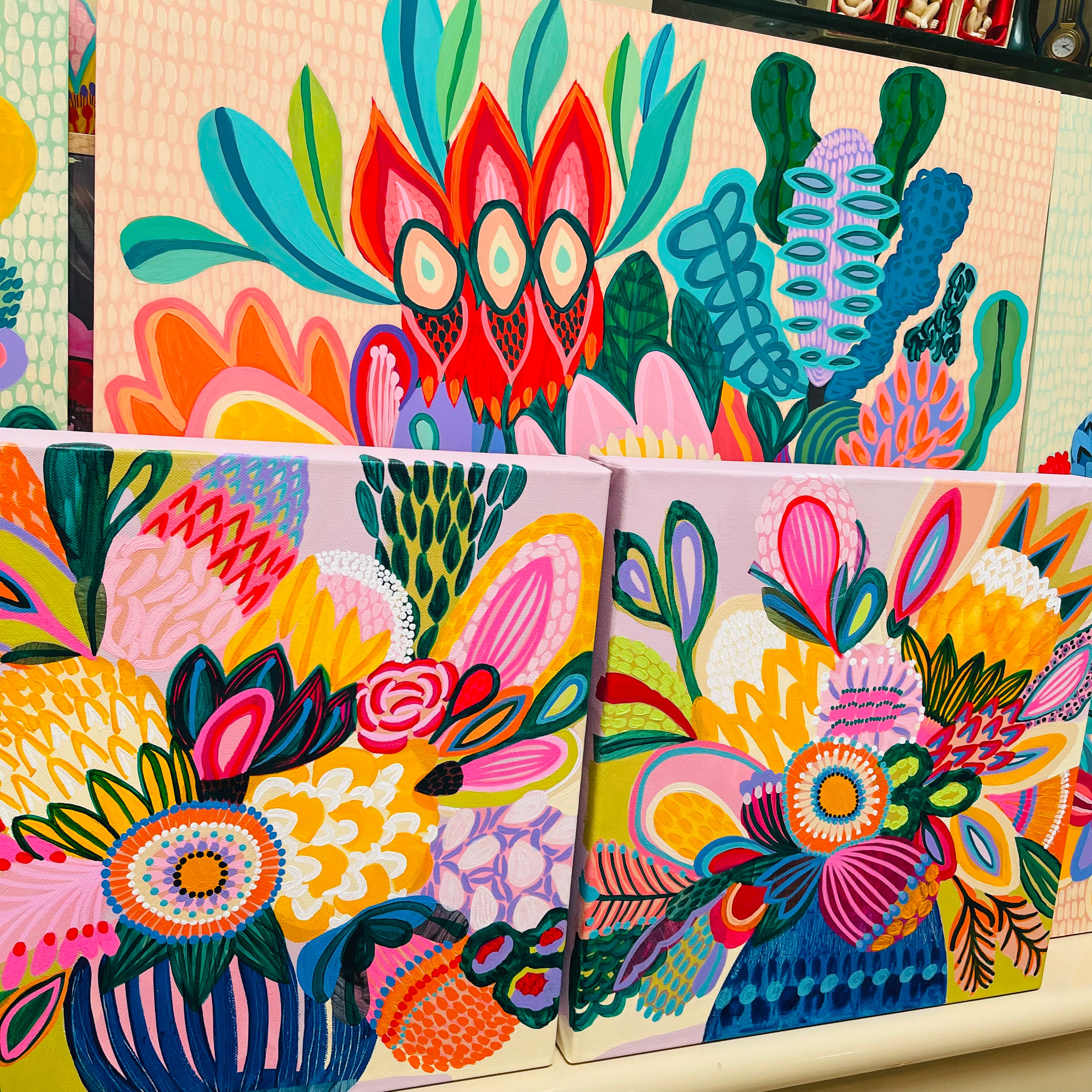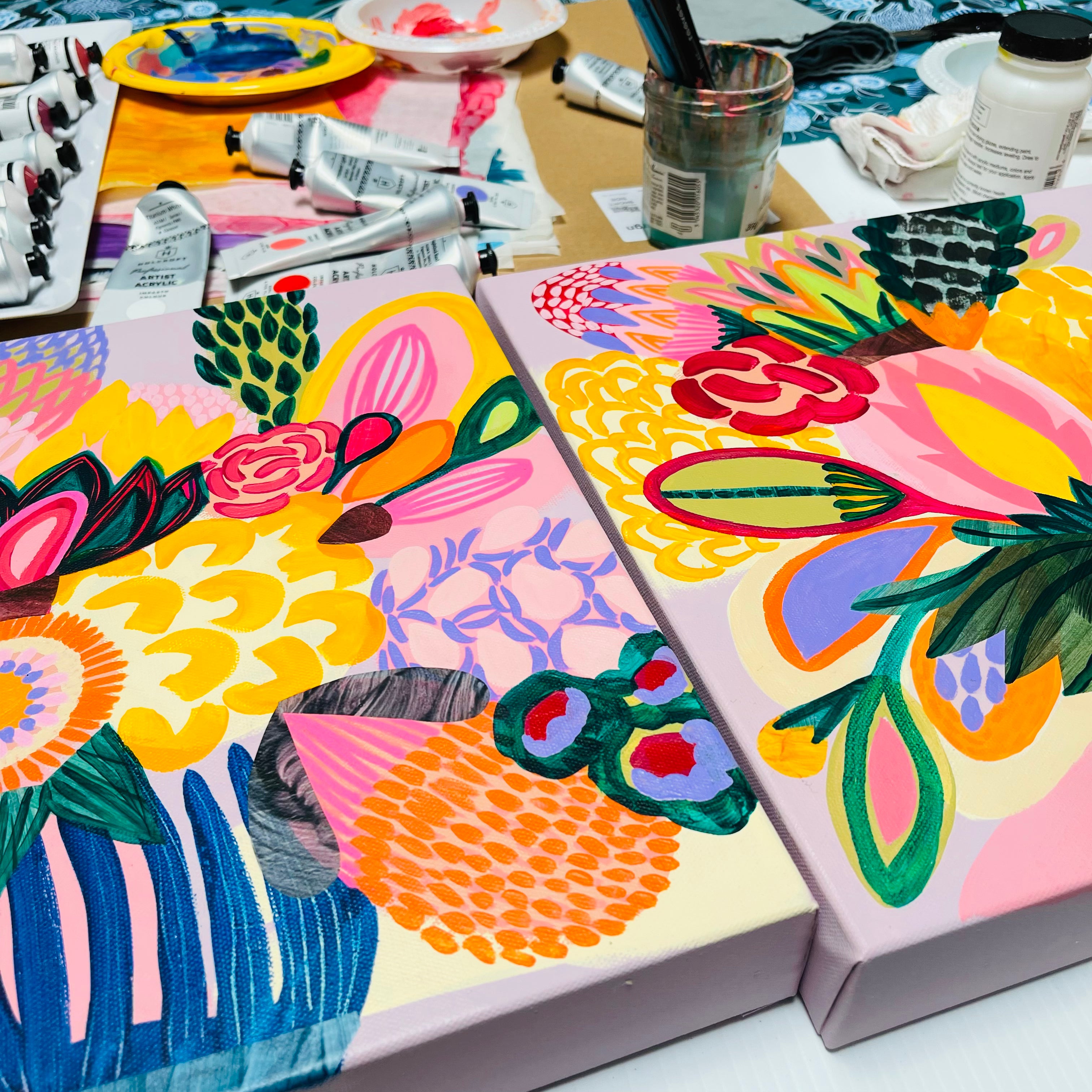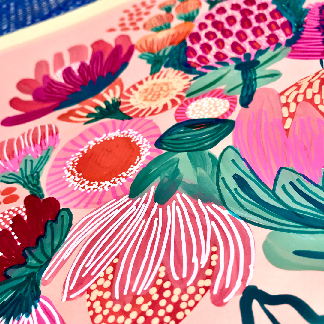 Each work is created slowly and intuitively, guided by colour, form, and feeling rather than fixed outcomes. While the paintings often begin with botanical reference, they are not literal representations. Instead, they are interpretations — shaped through layers, adjustment, and response — and refined over time until they feel resolved. These works exist as one-of-a-kind pieces, each holding its own presence while contributing to a broader, evolving body of work.