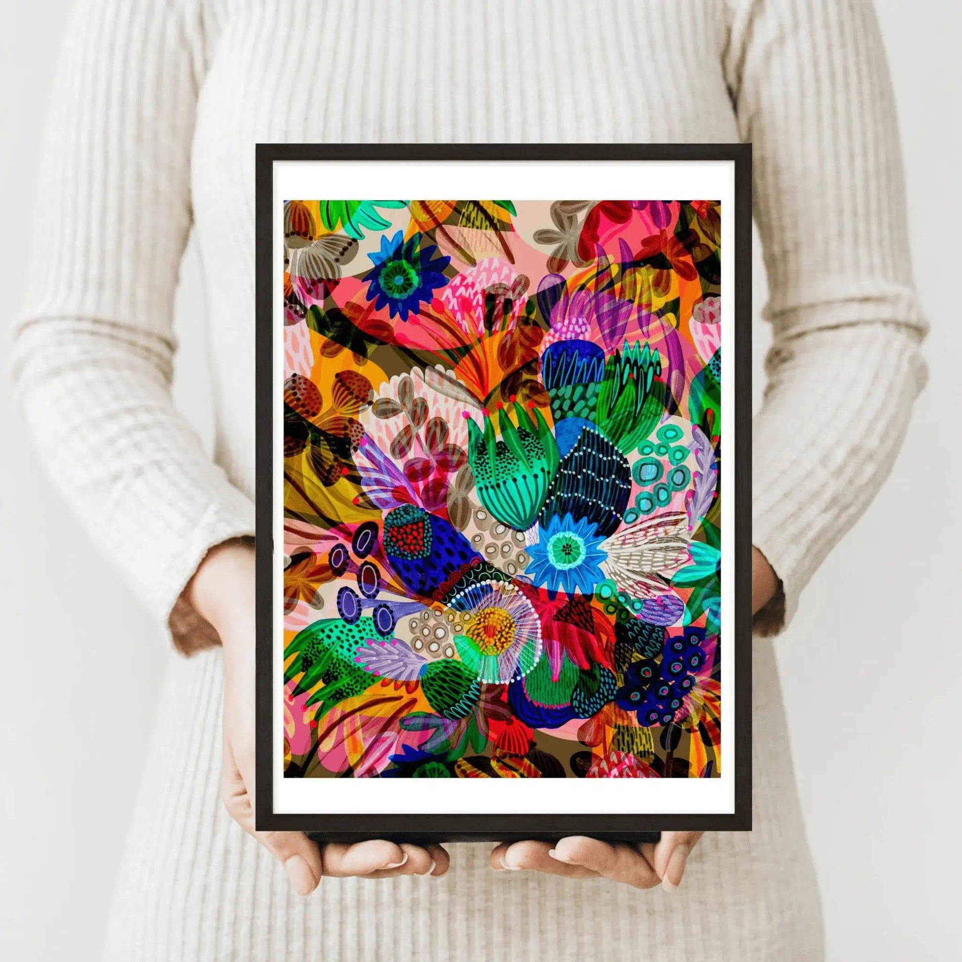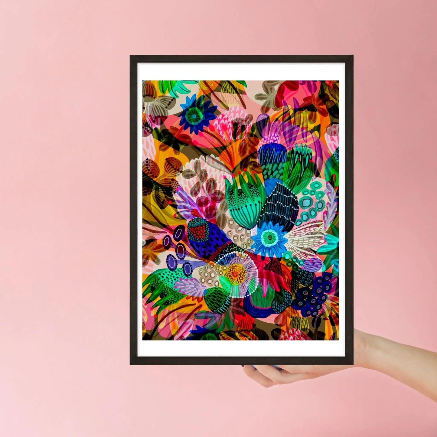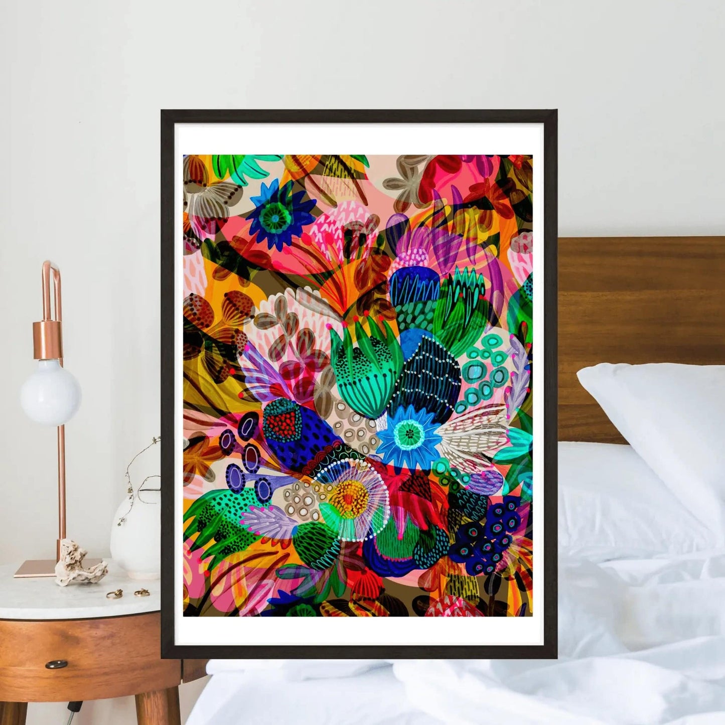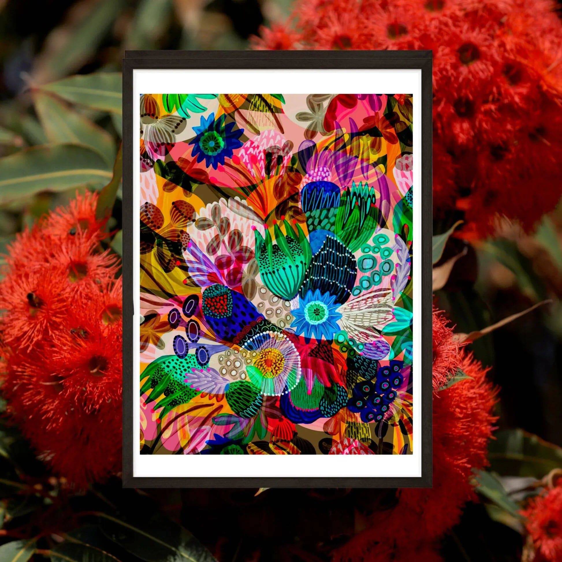 Add bold expression and colour to your walls with the ‘Garden of Eden’ Modern Abstract Wall Art Print by Australian artist Kirsten Katz. Inspired by Australian native flora, this vibrant giclée features layered textures, mixed media details, and vivid tones in a dramatic botanical composition.