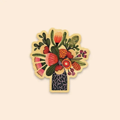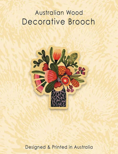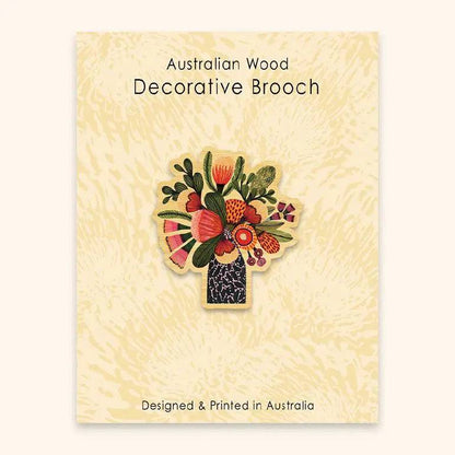 This stunning wooden brooch is decorated with the original artwork ‘Aussie Natives’ featuring banksias, proteas and gum nuts in a vase.