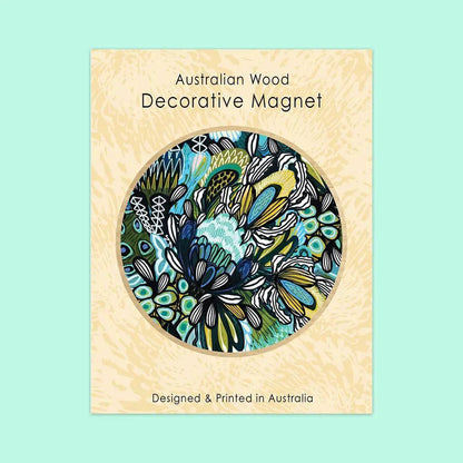 This beautiful set includes a round wooden magnet made from ethically sourced and sustainable Australian eucalyptus wood and printed with Greenguard Gold certified inks. The magnet and matching greeting card are made in Australia.