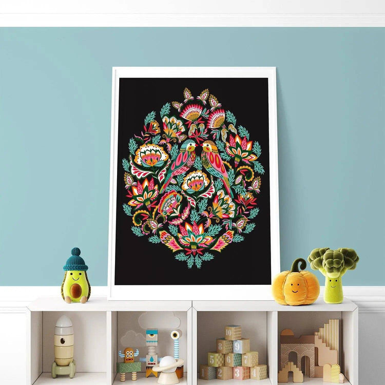 Each bird is adorned with colorful decoration, while the folk-style flowers add a delightful touch. The striking dark background makes this print suitable for modern decor, and it's the perfect addition to a baby's room, nursery, or toddler's playroom.