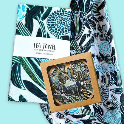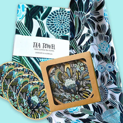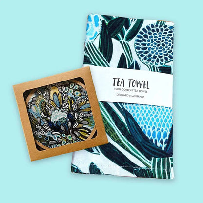Blue Banksia Tea Towel & Coaster Set