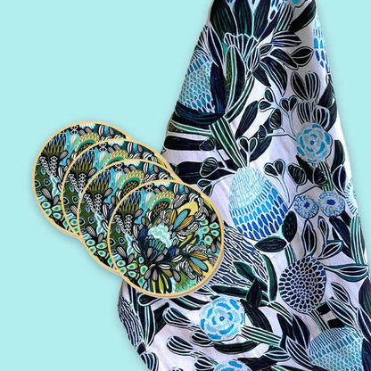 Look no further than the Blue Banksia Tea Towel & Coaster Set! This beautiful set features a designer tea towel and set of 4 wooden coasters, both printed with modern botanical designs of banksias and native flora by Australian artist Kirtsen Katz.