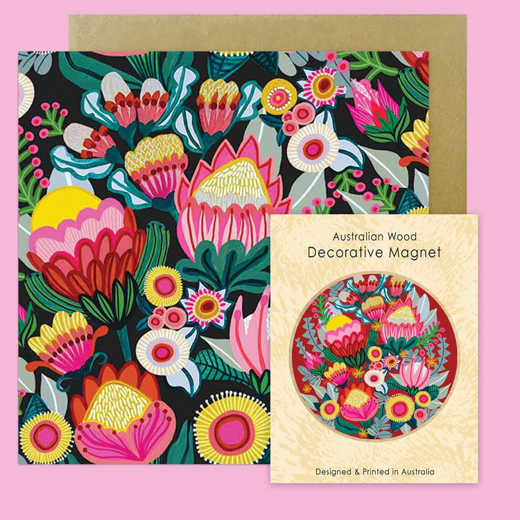 Introducing the Bush Proteas Modern Australian Eucalyptus Wooden Magnet & Card Gift Set – a stylish and unique gift set featuring original botanical art designed by Australian artist Kirsten Katz.