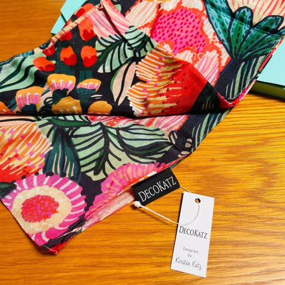 Add a burst of colour and artistic elegance to your wardrobe with the Flowers of Oz Cotton Silk Scarf. Crafted from a soft cotton silk viscose blend, this luxurious scarf showcases Kirsten Katz’s hand-painted Flowers of Oz design – a vibrant floral arrangement set against a rich blue background. Perfect as a thoughtful gift or a stylish addition to your own collection.