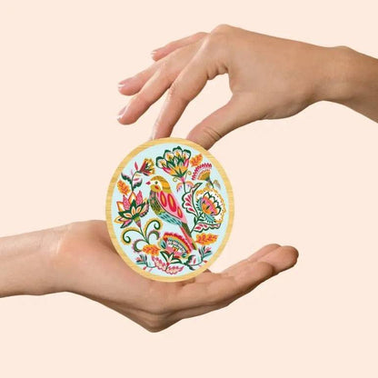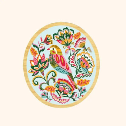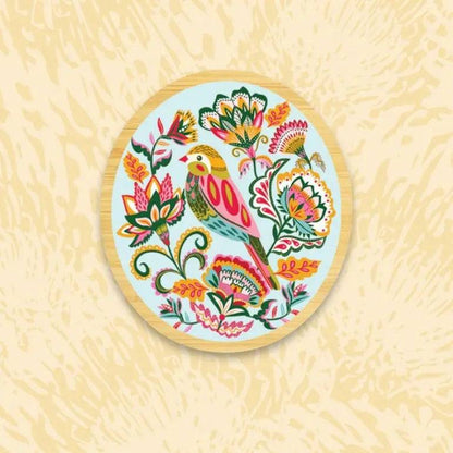 This stunning wooden brooch is decorated with the original artwork ‘Folk Finch’ featuring a pretty finch bird surrounded by stylised folk flowers