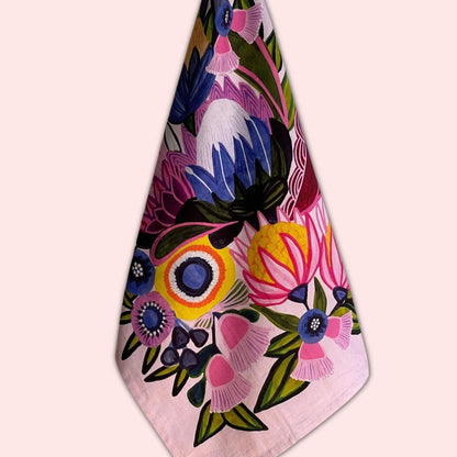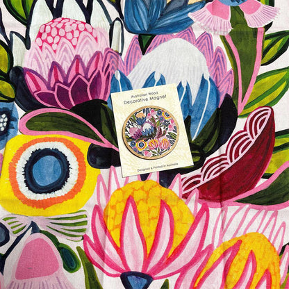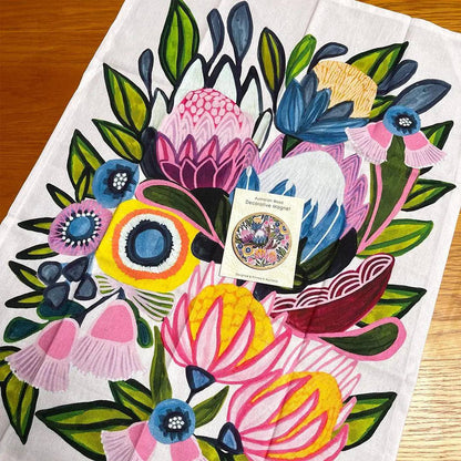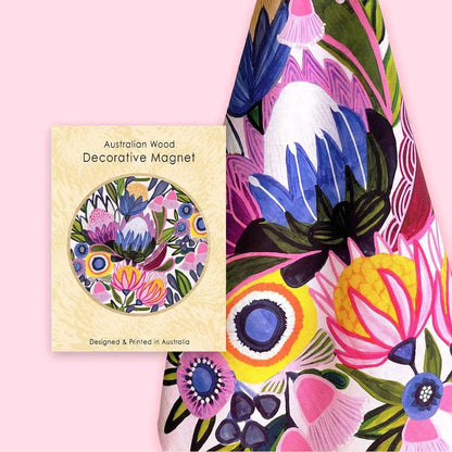 This is a stunning kitchen decor set that includes a beautiful designer tea towel and round wooden magnet, both printed with original artwork of protea flowers by Australian artist Kirsten Katz.