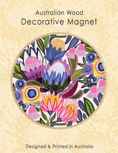 The round wooden magnet has been printed using Greenguard Gold certified inks and is made from ethically sourced and sustainable Australian eucalyptus wood. It measures 7cm in diameter and is the perfect way to add a touch of style to your fridge or other metal surface.