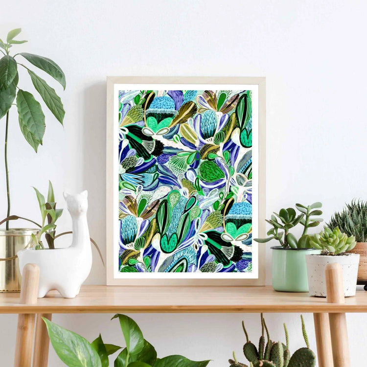This is a fine art print of an original mixed media artwork by Australian artist and designer Kirsten Katz. It features an abstract painting tropical native flowers. This painting has a wonderful green, blue and white colour palette that will add a touch of drama and upmarket coastal bohemian sheik to your home or office.
