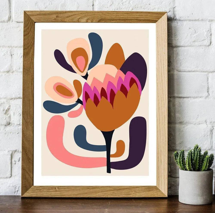Add a bold statement to your space with the Modern Protea Wall Art Print by Australian artist Kirsten Katz. Inspired by Scandinavian design and mid-century modern style, this striking giclée artwork features a stylised single protea flower in a crisp, contemporary colour palette.