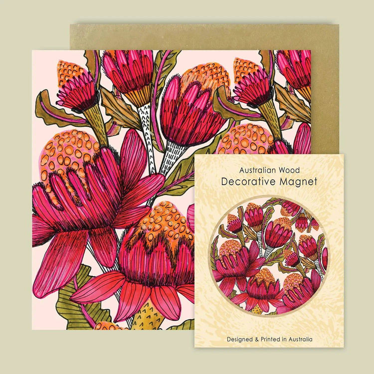 Look no further than the Australian Waratah Flowers Wooden Magnet & Card Gift Set!