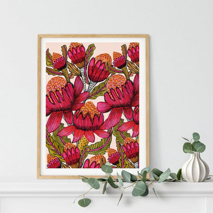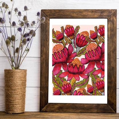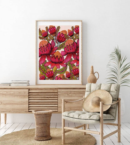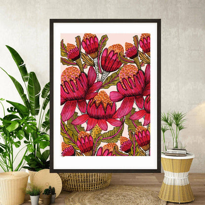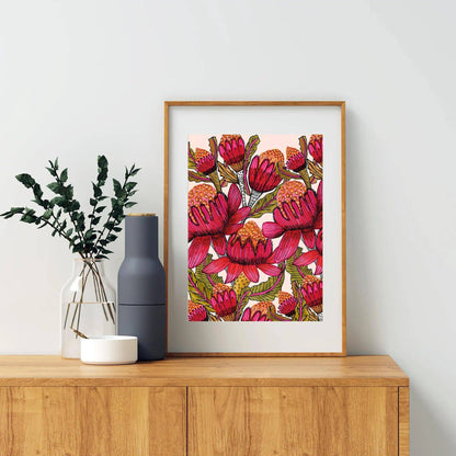 Celebrate the beauty of Australian flora with the Waratahs Wall Art Print by Australian artist Kirsten Katz. Featuring vibrant red waratahs and proteas with lush foliage, this giclée reproduction of an original watercolour painting is set against a soft blush pink background — creating a bold yet elegant statement for any space.