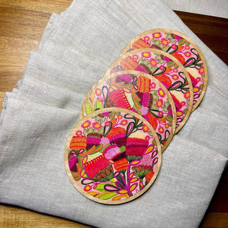 Welcome your guests in style and show your Aussie pride with the Wild Blooms amazing Wooden Coaster & Napkin Set!